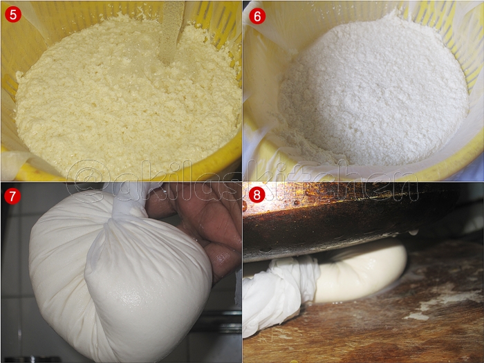 - In a strainer, cover with muslin cloth and pour the curdled milk.